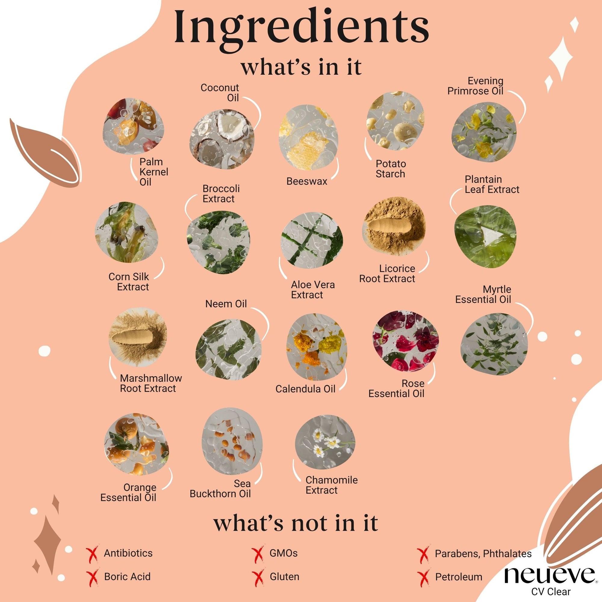 NeuEve does NOT contain boric acid, baking soda, petrochemicals, parabens, urea, glycols, and PEGs that harm friendly bacteria. Our goal is to support CV naturally and to prevent its recurrence by promoting a balanced vaginal microbiome.