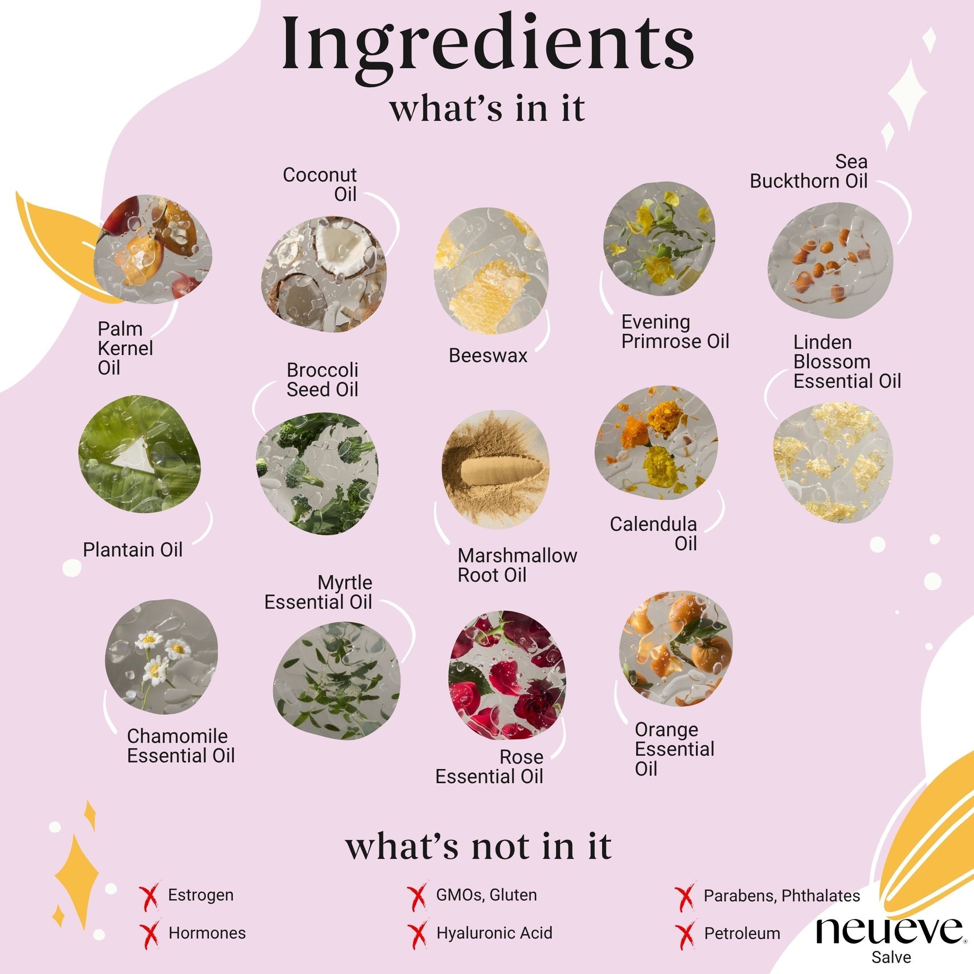 NeuEve Salve does NOT contain any synthetic chemicals, hormones, drugs, herbs (such as black cohosh and wild yam), yeasts, bacteria, petroleum products, artificial color, artificial fragrance, and preservatives such as parabens.