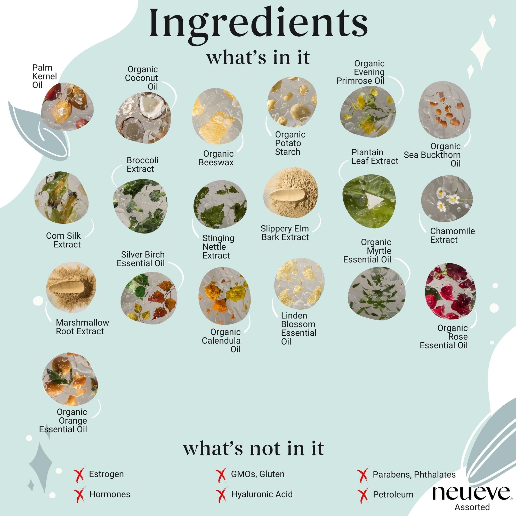 NeuEve Assorted does NOT contain any synthetic chemicals, hormones, drugs, herbs (such as black cohosh and wild yam), yeasts, bacteria, petroleum products, artificial color, artificial fragrance, and preservatives such as parabens.